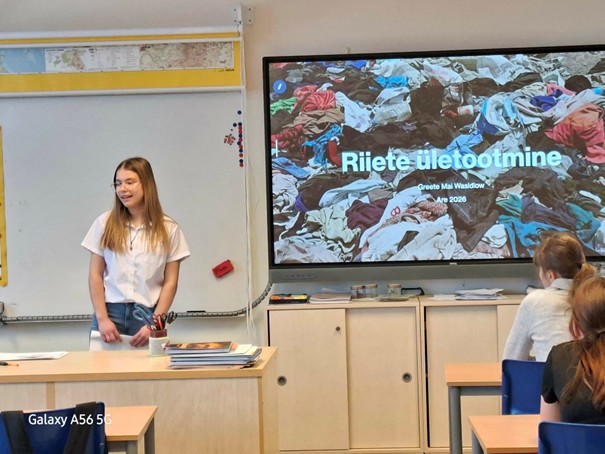 Viimasena esines 6.–8. klassi õpilastele meie oma 8. klassi õpilane Greete Mai, kes käsitles oma ettekandes väga aktuaalset teemat – riiete ületootmist ja sellega kaasnevat keskkonnakahju. Greete Mai selgitas, kuidas kiirmoe levik on suurendanud rõivatööstuse mõju loodusele: alates suurest veekulust ja kemikaalide kasutamisest kuni tekstiilijäätmete kiire kasvuni. Ta tõi näiteid sellest, kui lühikese elueaga on sageli odavad rõivad ning kui palju riideid visatakse ära juba pärast vähest kandmist.